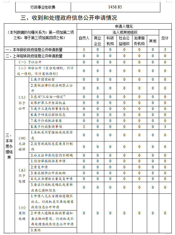 2.依申請公開辦理情況。按照政府信息公開相關(guān)工作規(guī)程,認(rèn)真落實(shí)簽收、登記、審核、辦理、答復(fù)、歸檔等工作,增強(qiáng)答復(fù)內(nèi)容的針對性和形式的規(guī)范性,依法做好依申請公開。全年接受依申請公開共3件,主要涉及假期管理等工作,已在法定時(shí)間內(nèi)通過郵政快遞寄出答復(fù)。為確保準(zhǔn)確答復(fù),主動(dòng)聯(lián)系申請人校驗(yàn)申請內(nèi)容,并嚴(yán)格根據(jù)《江蘇省政府信息公開申請辦理答復(fù)規(guī)范》予以答復(fù)。對于不屬于本機(jī)關(guān)公開范圍的政府信息,均依法告知,并盡可能提供指引與建議,協(xié)助其明確后續(xù)申請方向。